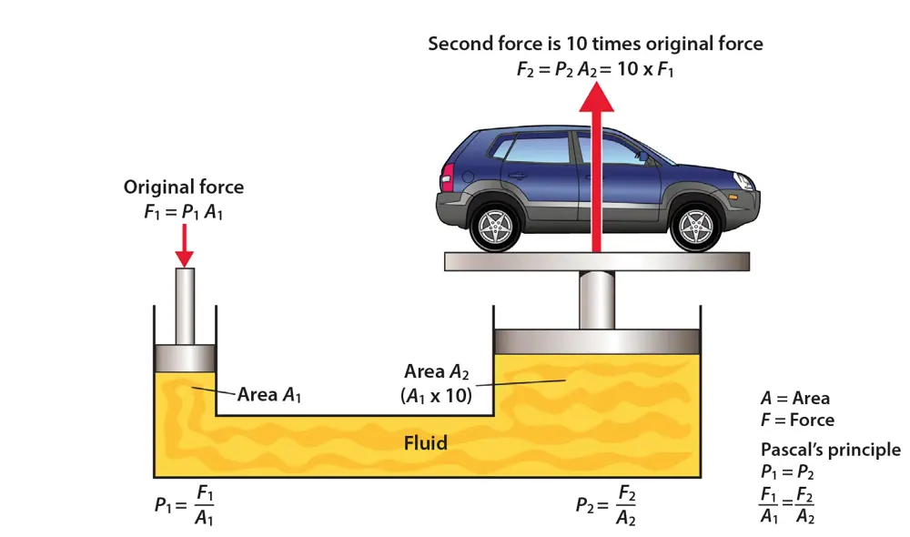 In a hydraulic press, this first ‘syringe’, where the smaller force is applied, is technically known as the pump, while the second, applying the larger force, is known as the ram. This multiplier effect is why mechanics can raise a one-tonne car with a few pumps of the handle. Inside the car, another hydraulic system ensures that when you apply the brakes with a modest force, the car comes – with the help of friction, of course – to a stop.
