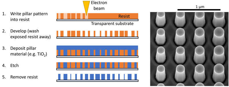 (Left) the process of electron beam lithography. (Right) gallium nitride pillars made by electron beam lithography at Kelvin Nanotechnology (Glasgow).