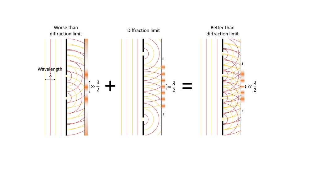 Waves have alternating crests (yellow) and troughs (red) that repeat after a distance known as wavelength λ. Light waves consist of an oscillating electric (and magnetic) field, with crests and troughs corresponding to the largest field in opposite directions. If light waves pass through a pair of slits, they will form a series of dark lines (crest meets trough, white) and bright lines (crests or troughs meet, orange). The lines become narrower as the slits are moved further apart until they reach a minimum width of half a wavelength: the diffraction limit. Smaller, indeed arbitrarily small, lines or focal spots may be achieved by combining several pairs of slits.