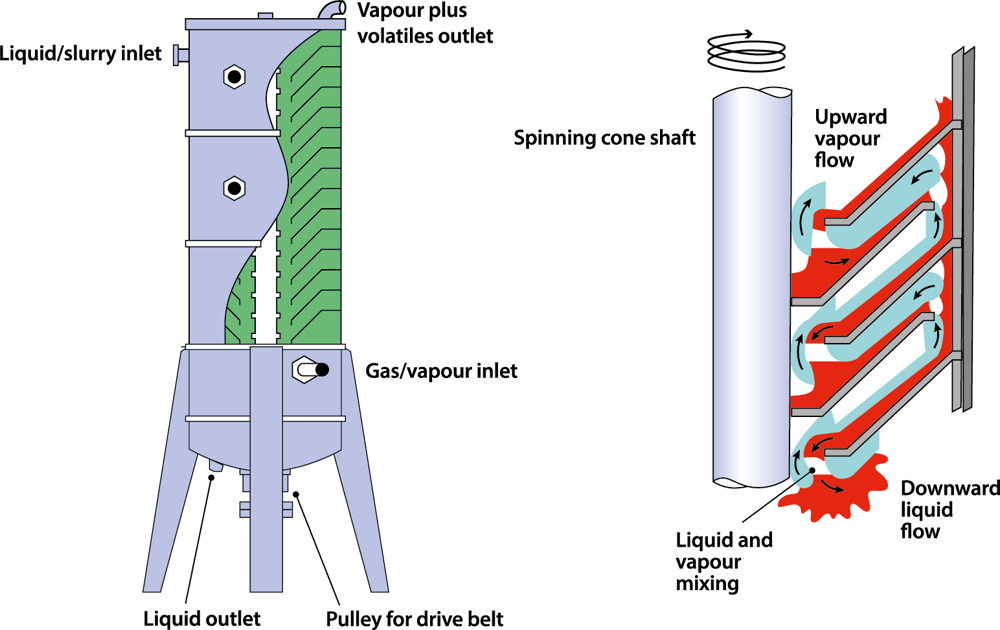 Vacuum distillation takes place inside a stainless-steel column. Within this, the liquid is passed through a series of spinning cones to form a thin liquid from which the alcohol evaporates © diagram adapted from Flavourtech.com