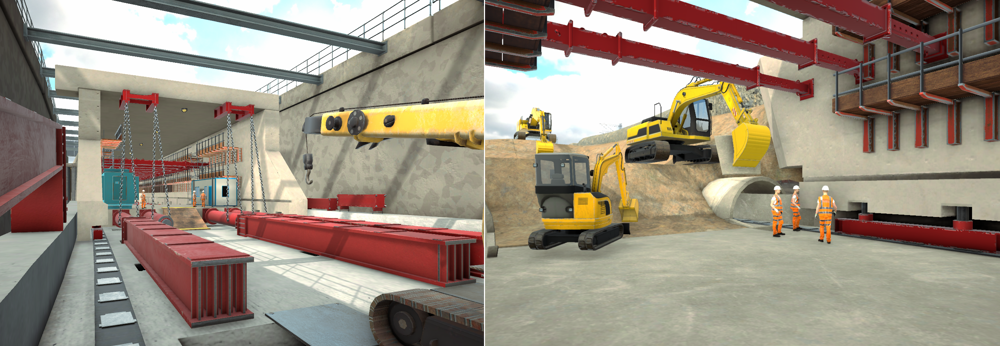 Two stills from an animation used in training for the construction team before the jack. (left) the rear of the portal, with four 1250t jacks slung from the portal roof and attached to a thrust slab spanning between the portal feet at the rear of the structure. The jacks pushed against movable steel reaction frames (foreground) engaged in pockets in the foundation slab beneath. (right) The front of the portal during the shove, showing excavators at work and the top of the linings for the right-hand guide tunnel being removed to reveal the slide path with its PTFE pads, on which the steel skidding beams run